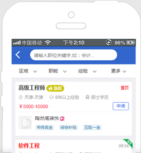 - 海量工作機(jī)會(huì)等著您,同一時(shí)刻您將面對(duì)數(shù)以十萬(wàn)的工作機(jī)會(huì);幫助您記憶最近搜索條件,簡(jiǎn)化您的搜索操作。